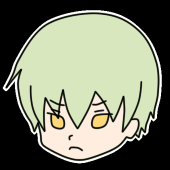 髪色は白に近いごく薄い翠で毛先に行くに従って濃い微透明ショート。眼は虹彩が橙。くっきり二重、時々三重。性格