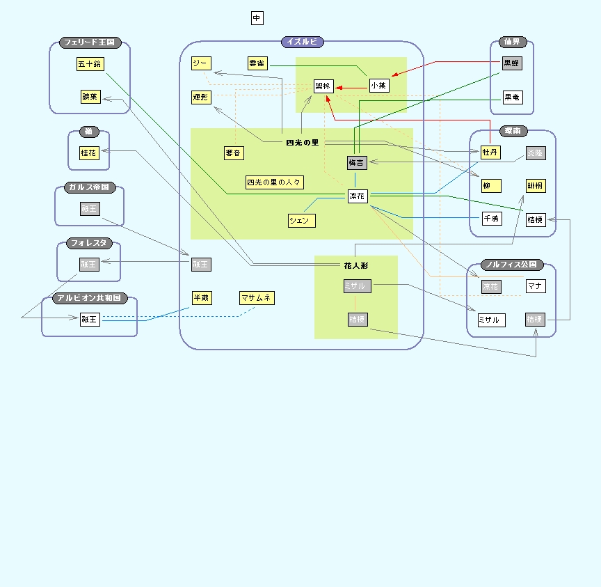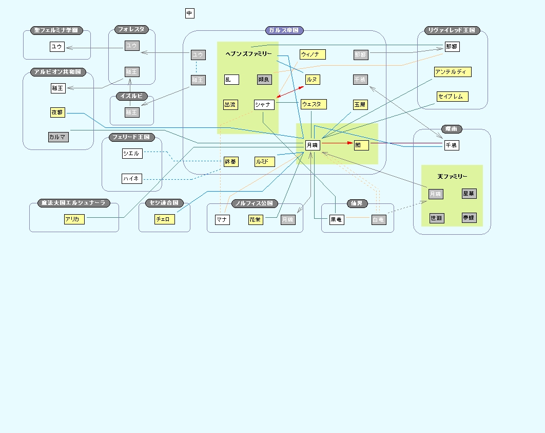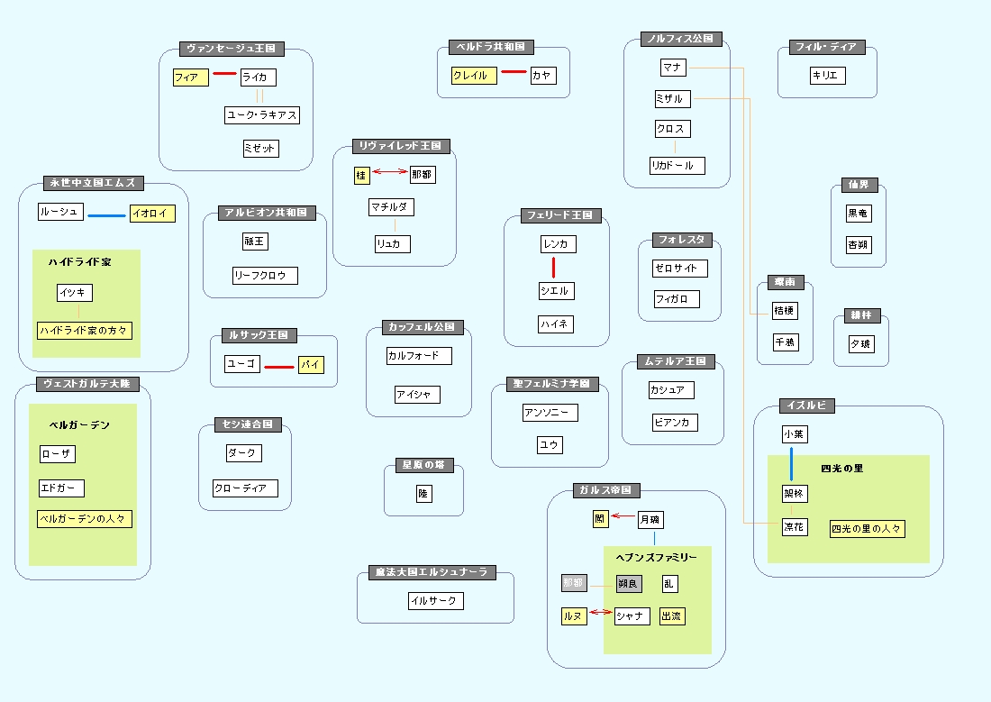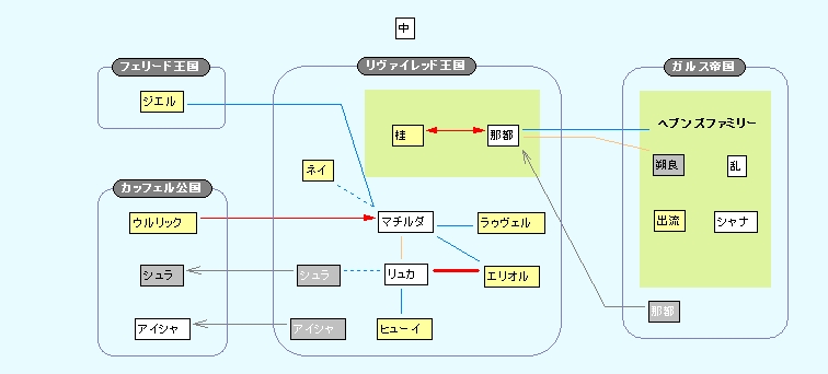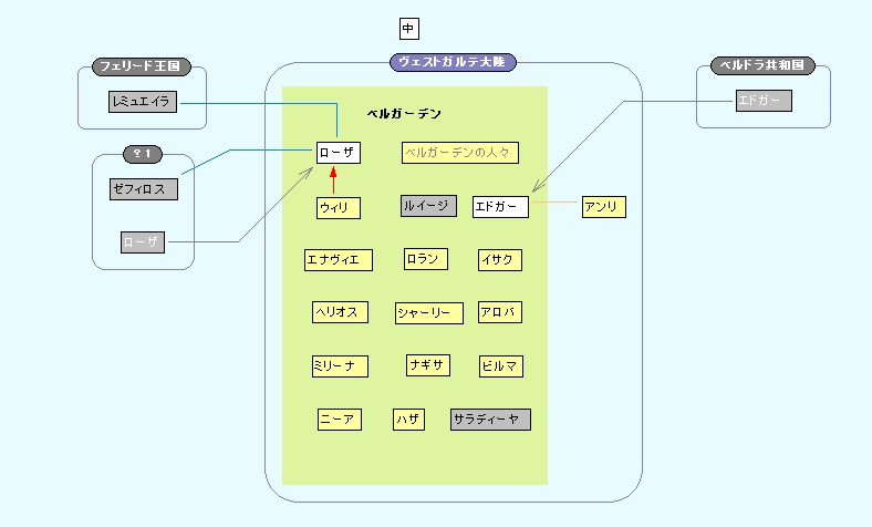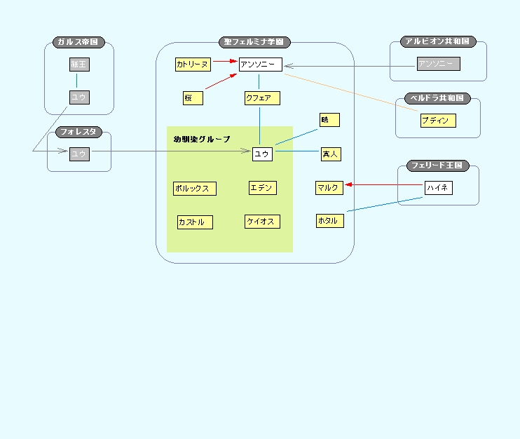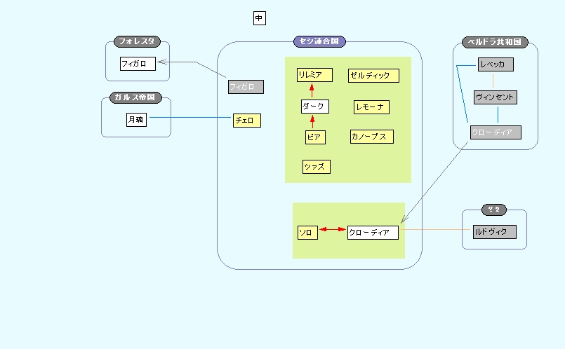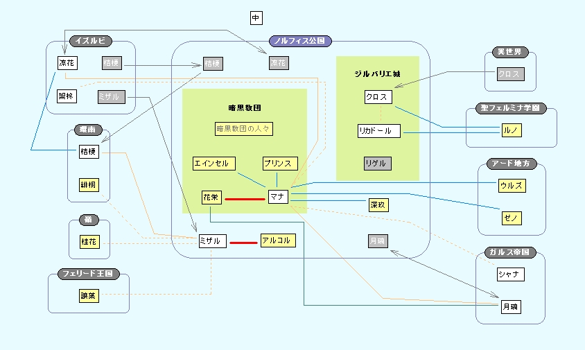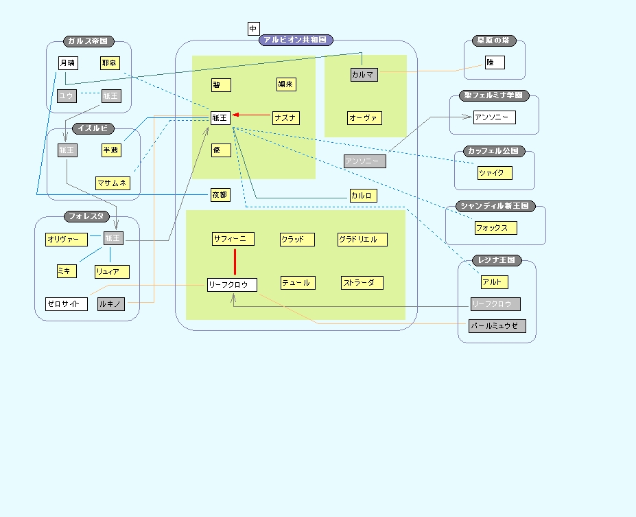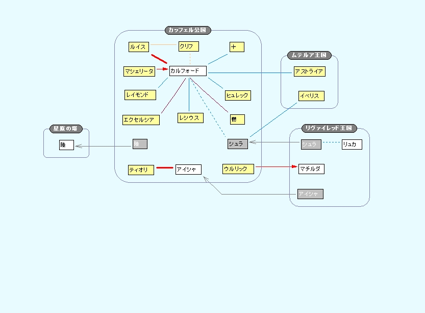 「ぱっと見て一目で関係とか分かるように」この関係図作り始めたんだけど、これ逆に分かりづらくないか。