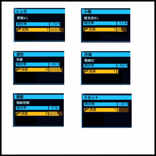 降伏率(高いほど戦闘時すぐ逃げる。マイナス値が高いほど勇敢に戦います)